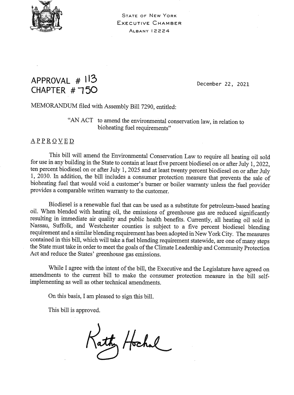 Today, New York State took a major step forward on the path to net-zero emissions, when Governor Kathy Hochul signed a bill phasing in a requirement for all heating oil sold in state to contain 20% biodiesel. Once fully implemented, the new law will reduce New York’s annual petroleum diesel consumption by approximately two hundred million gallons per year, cutting the state’s annual carbon emissions by approximately 1 million metric tons.